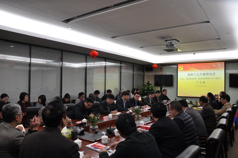 根据省电子信息集团党委统一安排,2017年12月12日下午,集团党委委员、副总经理兼AG电子官方网站董事长卞志航到公司作党的十九大精神宣讲。AG电子官方网站党委书记李震主持报告会,公司机关支部全体党员、本部助理以上管理人员以及成员企业、事业部副总以上领导共计40余人参会。