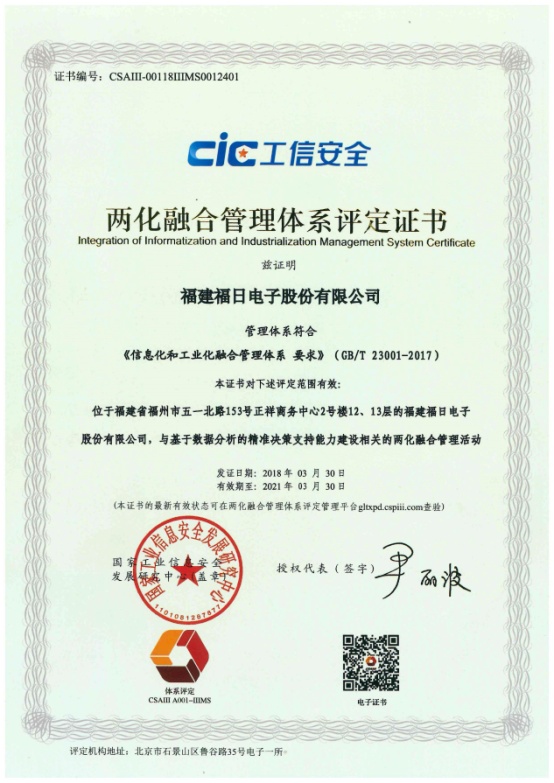 2018年330日,福建AG电子官方网站股份有限公司获得了工信部两化融合管理体系评定证书。公司20176月启动两化融合管理体系贯标,打造信息化环境下的新型能力——基于数据分析的精准决策支持能力,并于20178月列入工信部“2017年两化融合管理体系贯标试点企业名单。通过本质贯标,公司在福建省电子信息集团系统先行先试,率先通过两化融合管理体系贯标评定。公司将不断完善两化融合管理体系,促进两化融合建设成果深化应用,提升公司核心竞争力。