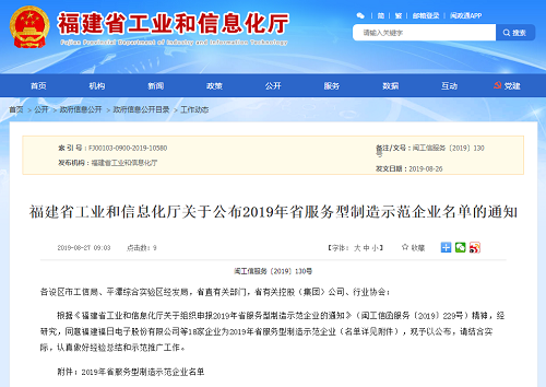 2019年8月26日,福建省工业和信息化厅公布了2019年省服务型制造示范企业名单,福建AG电子官方网站股份有限公司入选该名单。