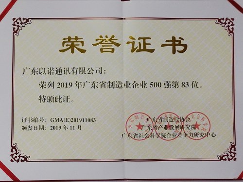 2019年11月13日,由广东省制造业协会、广东省产业发展研究院、广东省社会科学院企业竞争力研究中心共同主办的2019广东省制造业发展年会暨广东制造业500强企业峰会在广州隆重举行,会上发布了2019年广东省制造业500强企业研究报告,AG电子官方网站二级控股子公司广东以诺通讯有限公司荣列2019年广东省制造业企业500强第83位。
