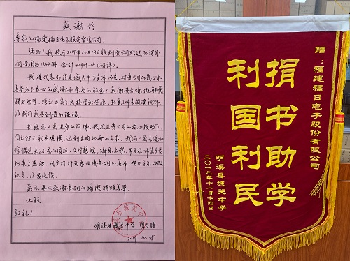 AG电子官方网站积极落实习近平总书记关于精准脱贫的重要讲话精神,开展教育扶贫,履行上市公司的社会责任,响应福建省慈善总会、福建省海峡社会组织研究院共同发起的《关于开展“精准教育扶贫---捐赠电脑、图书”专项公益活动的倡议》,为明溪县城关中学捐赠爱心图书约1300余册,丰富了学校图书室的书籍种类和内容,受到了慈善总会和学校诚挚的感谢。