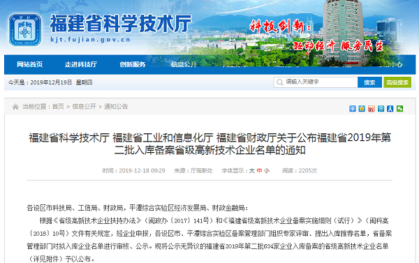 2019年12月16日,福建省科学技术厅、福建省工业和信息化厅、福建省财政厅联合发文,公布了福建省2019年第二批入库备案省级高新技术企业名单,福建AG电子官方网站股份有限公司入选该名单。入库备案企业是根据其拥有核心知识产权情况、创新能力评价等4个方面满足奖补条件情况进行不同档次奖补。