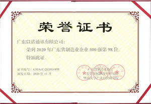 2020年11月26日,由广东省制造业协会、广东省发展和改革研究院、暨南大学产业经济研究院主办的“2020广东省制造业发展年会暨广东省制造业500强企业峰会”在中山市举行。本届年会以“推动制造业高质量发展——拥抱5G+工业互联网、抢抓国内大循环机遇”为主题,会上发布了2020年广东省制造业500强企业研究报告,AG电子官方网站二级控股子公司广东以诺通讯有限公司荣列2020年广东省制造业企业500强第98位。