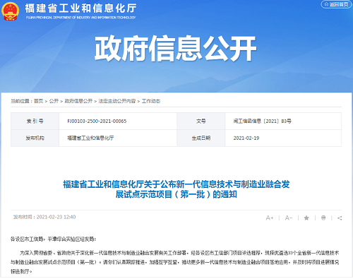 近日,福建省工信厅公布新一代信息技术与制造业融合发展试点示范项目(第一批)名单,福建AG电子官方网站股份有限公司项目“基于数据分析的精准决策支持能力”入选该名单。该名单由各设区市工信部门项目评选推荐,主要涵盖5G+工业互联网、工业互联网、工业APP、企业上云和大数据五个方面。