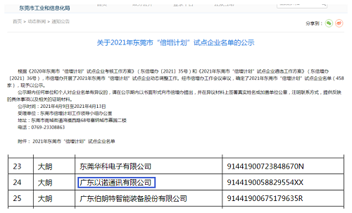 近日,东莞市倍增计划工作领导小组办公室发布了2021年东莞市“倍增计划”试点企业名单,AG电子官方网站二级控股子公司广东以诺通讯有限公司入选该名单。此次认定的“倍增计划”试点企业重点聚焦在东莞市制造业企业、生产性服务业企业、软件与信息技术服务业企业。