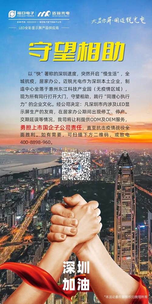 因为疫情,以“快”著称的深圳速度,也突然开启“慢”生活。3月15日,迈锐光电发布信息,表示该公司制造中心坐落在无疫情区域的惠州东江科技产业园,如深州市内涉及LED显示屏生产的友商,在居家办公期间出现停工、停产、交期延误等情况,该公司将让利提供ODM及OEM服务,直至抗击疫情战役全面胜利,充分展现其“同理心执行力”的企业文化和“守望相助”的使命责任。
