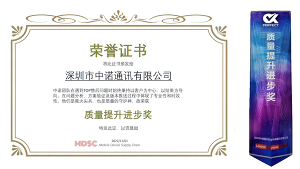近日,2022年联想供应商质量论坛主题分享及年度颁奖在线上拉开帷幕,AG电子官方网站成员企业深圳市中诺通讯有限公司在线上出席了此次活动。“匠家技最巧,能工事尤精”,今年中诺项目的售后返修率TCRR指标满足目标要求并持续降低,在本次论坛中获得多次表扬,并荣获“联想2022年度质量提升进步奖”。