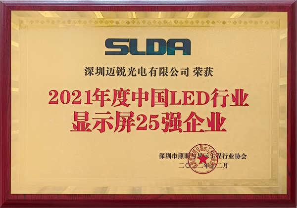 近日,AG电子官方网站成员企业迈锐光电荣获“2021年度中国LED行业显示屏25强企业”及“《Mini LED室内商用显示屏》优秀参编团体”两项行业荣誉。